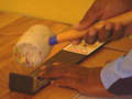 6. For a tight fit, grab a small scrap piece of the flooring and fit it into the grooves of the last piece. Place a block on the end of the scrap piece and knock it with a mallet a few times until it locks into place (figure B). Do not try to knock the wood directly, as it may damage the edge. If a piece is damaged, save it to use later as an end piece.